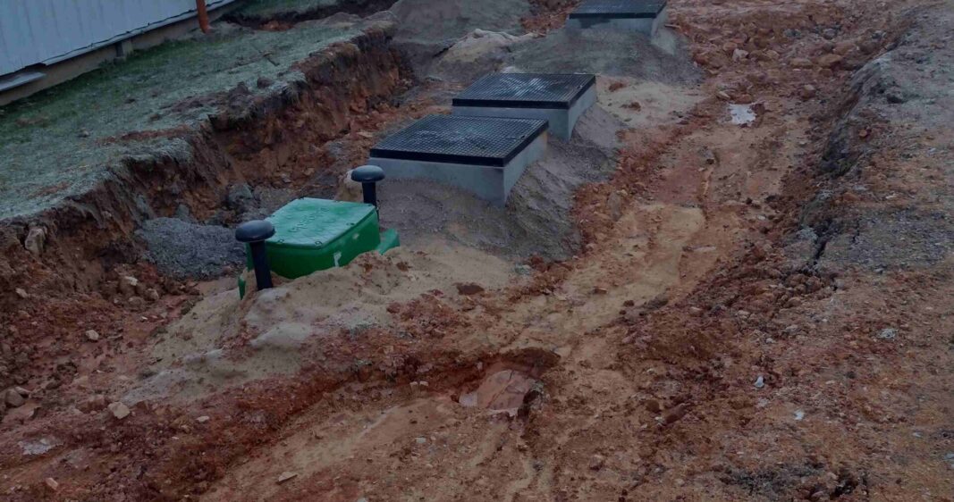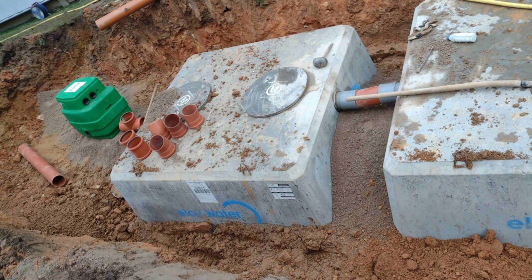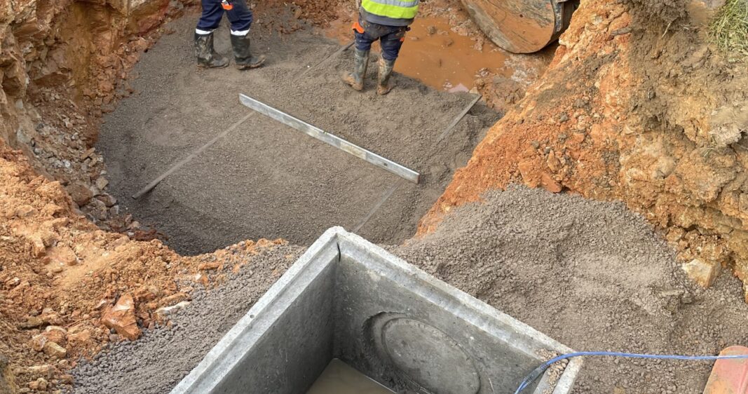Transformation de la fosse septique existante en station de relevage, installation de pompes de relevage, pose d’une conduite sous pression vers la nouvelle station d’épuration, installation d’une nouvelle microstation de 27 EH – Poids des éléments : 5.750kg & 6.730kg