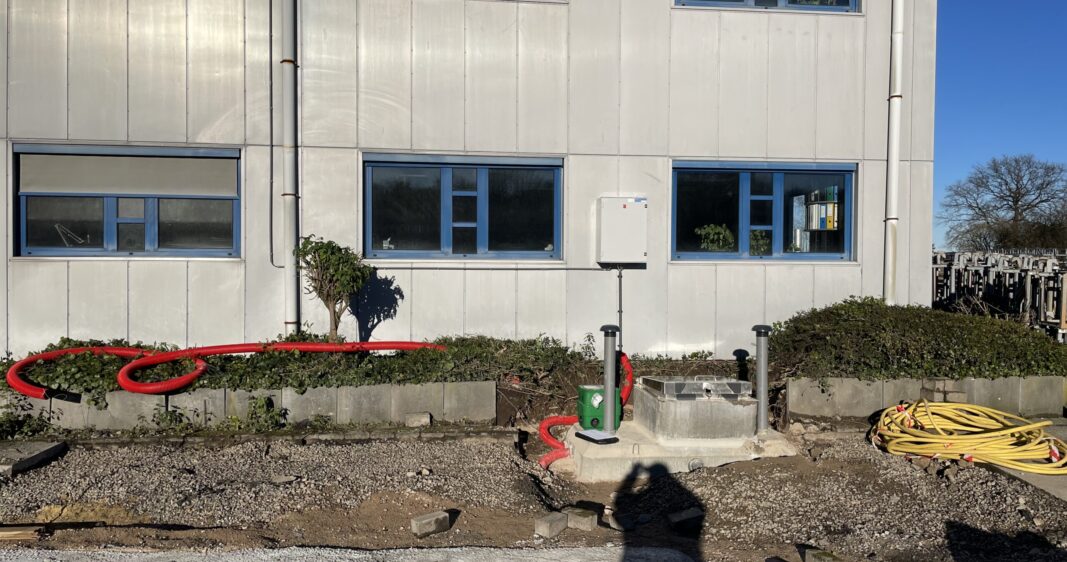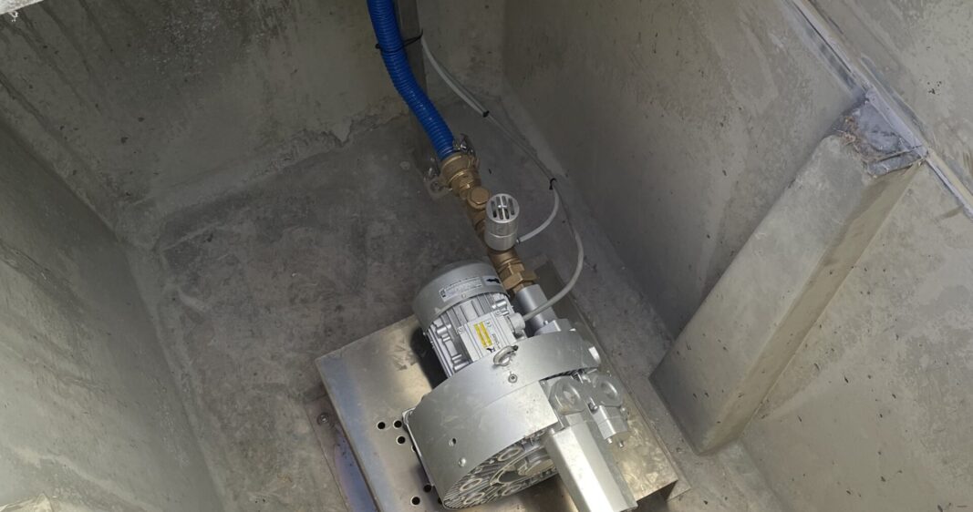Une installation de cette taille nécessite un surpresseur puissant en 400V, installé ici dans un local technique souterrain de 2.043kg et son tableau de commande en façade.