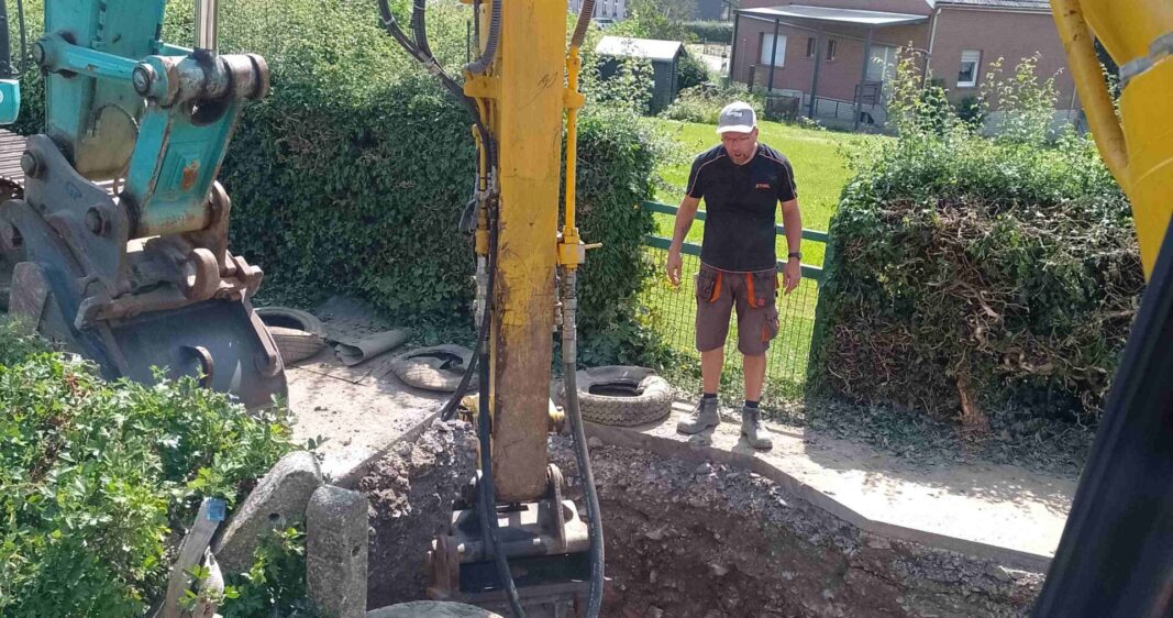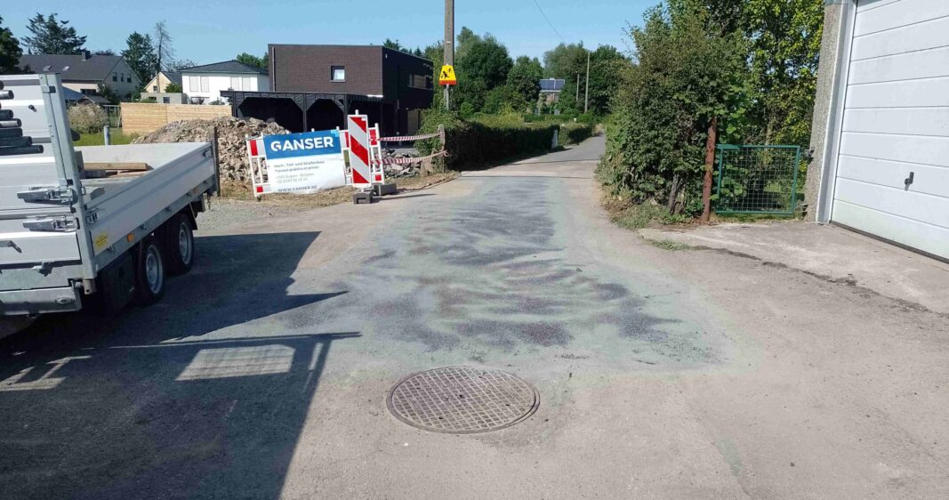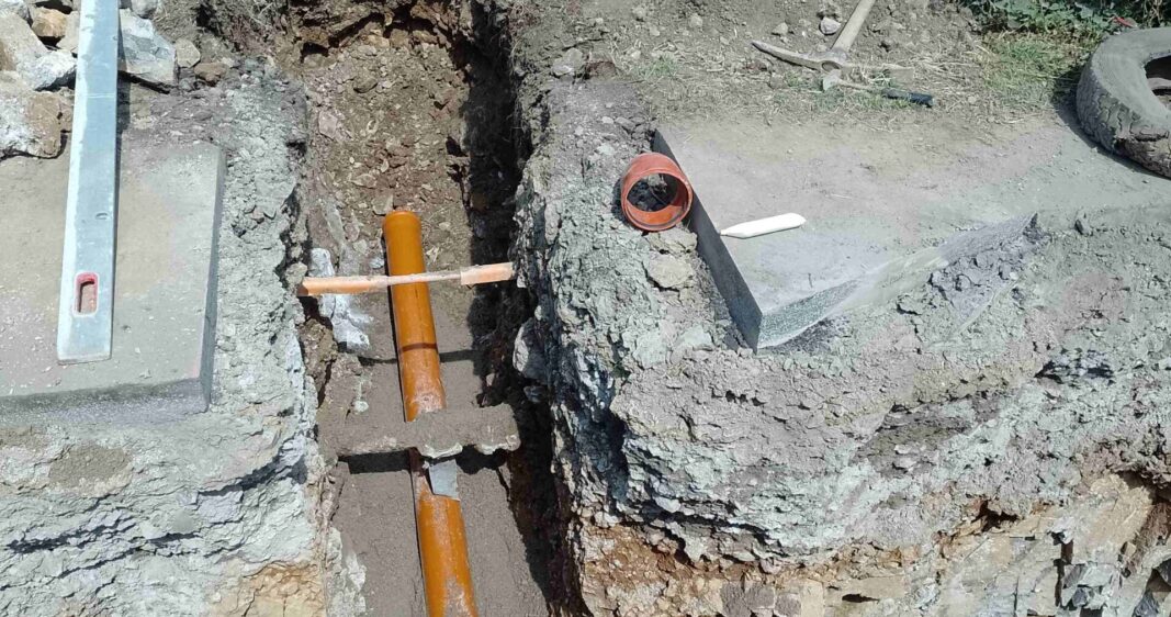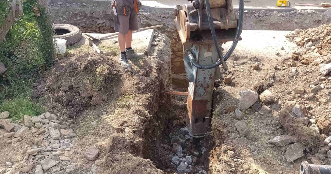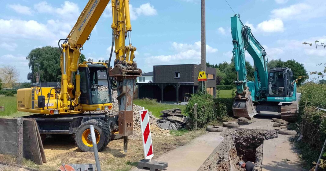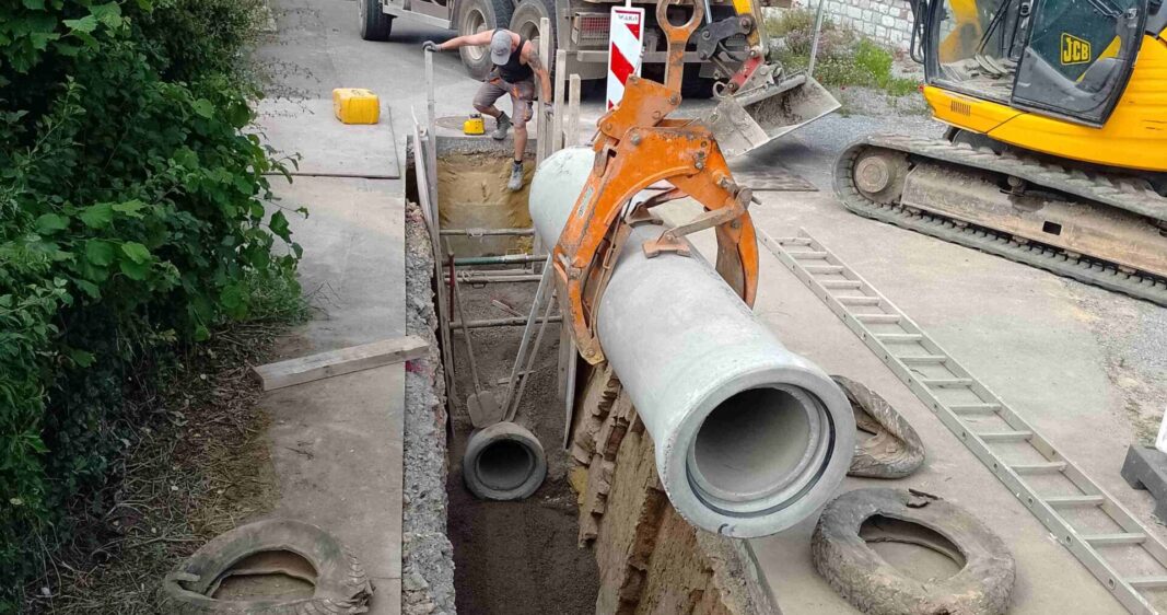 Prolongation de l’égout public, pose d’une nouvelle chambre de visite, démolition de massifs rocheux, pose du raccordement de la maison à construire, fermeture tranchées et asphaltage.