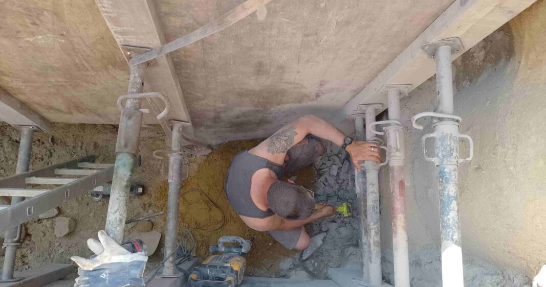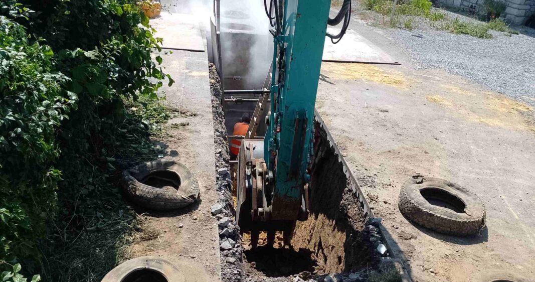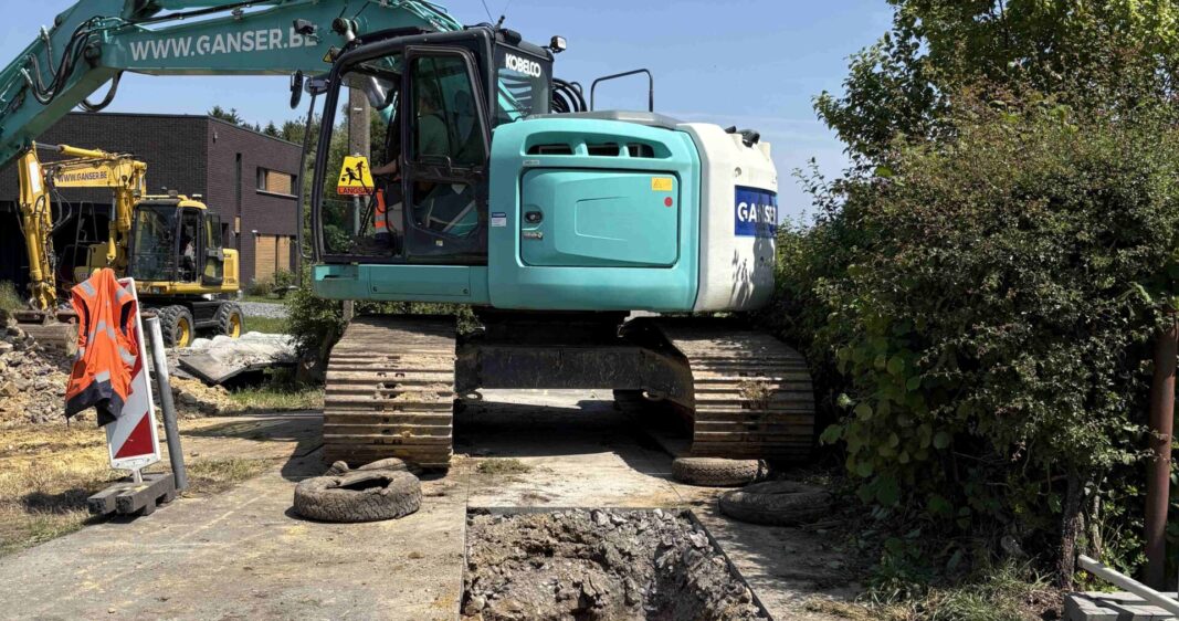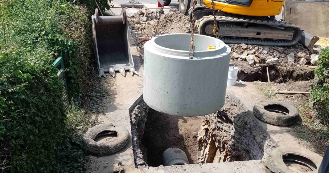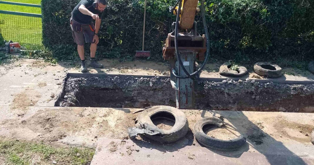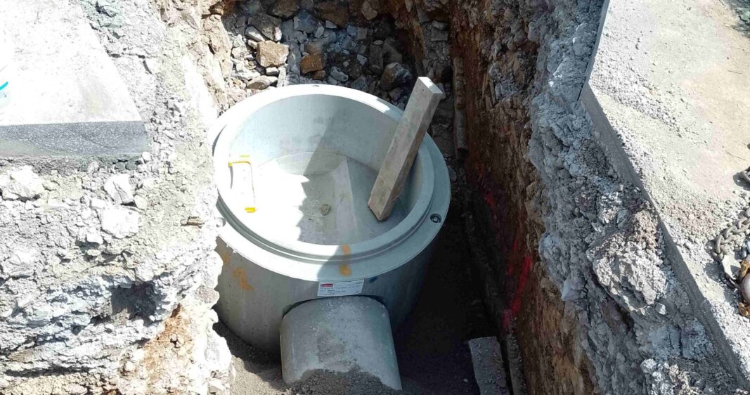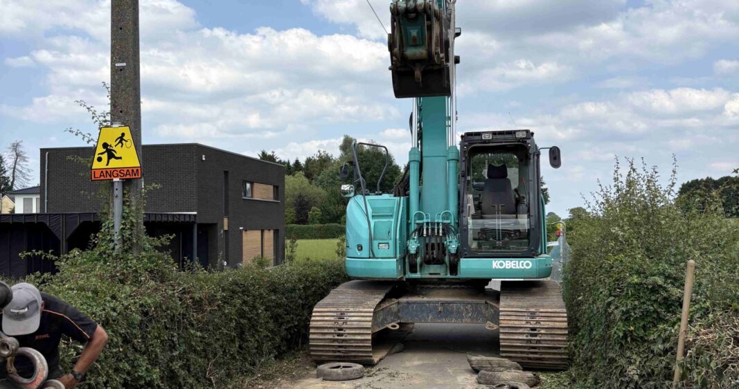 Prolongation de l’égout public, pose d’une nouvelle chambre de visite, démolition de massifs rocheux, pose du raccordement de la maison à construire, fermeture tranchées et asphaltage.